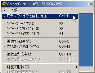 ・メニューから「アクティブウィンドを自動捕捉」を選択します。 解除したい時は、もう一度選択します。 注意:ウィンドウが最大化・最小化されていたり、ウィンドウサイズがデスクトップサイズ以上の場合は、自動捕捉しません。 ※捕捉後、アクティブウィンドウの位置やサイズを変更しても自動で再調整されます。 |