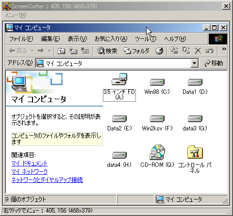 マイコンピュータのウィンドウをアクティブにした後、直ぐにScreenCutterが捕捉し、ピッタリと