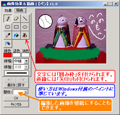 コピーされた画像に簡単な描画編集が行えます。使い方はWindows付属の「ペイント」に準じています。