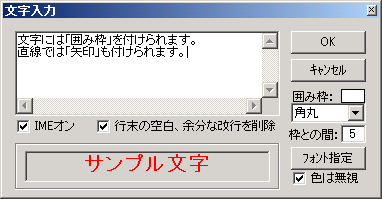 ●文字の場合 文字入力後に位置を指定します。 注意: フォントダイアログの文字色は固定色なので 「色を無視」にしないと、出力色が変ってしまう ことがあります。 |
