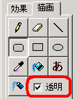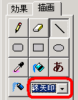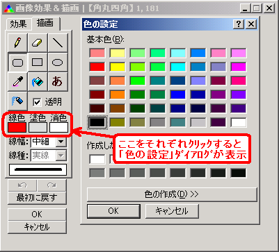 ●色について 1.線色・・・線・文字の描画色。 2.塗色・・・四角・だ円・角丸四角の内部色。 3.消色・・・消しゴムの色。 右クリックを使うと、消色が描画色になります。 つまり、右クリックすればそのまま消しゴム代わりになります。(下図) ![]() |