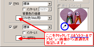 ※PNG/GIFでは、透過色を画像から指定するための スポイト機能が使えます。 |