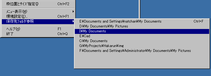 ●保存先フォルダをメニューから直接参照することができます。(下図) ※最新の保存先フォルダはショートカットキー(CTRL+F)でも参照できます。 |