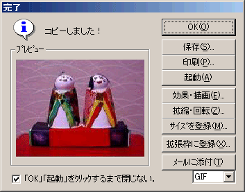 コピーされた画像はプレビューに表示されます。 保存 : 画像をBMP/JPG/PNG/GIF形式で保存 印刷 : 画像を印刷します 起動 : 関連(指定)アプリケーションを起動し画像を閲覧 効果・描画 : 画像に各種効果(エフェクト)やペイント処理をします 拡縮・回転 : 画像を拡大縮小し、回転を加えます サイズを登録 : お気に入りにフレームサイズを登録 拡張枠に登録 : 画像を拡張枠として登録設定します メールに添付 : 画像をメーラーに添付して起動します ※「OK」「起動」をクリックするまで閉じない 保存してから印刷するという作業を続けて行うことが出来ます。 |
