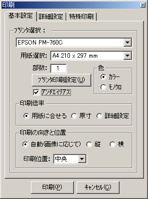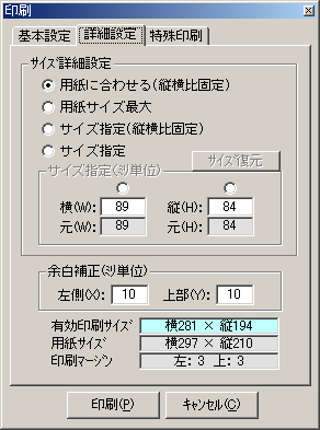 | ●印刷倍率の「詳細設定」を有効にすると右上図の「詳細設定」のサイズ詳細設定が利用できます。 ●アンチエイリアスを有効にするとギザギザの少ない綺麗な画像を印刷できます。(拡大の場合に効果があります) ◎プリンタ印刷設定 プリンタプロパティより設定を行います。 注:各プリンタドライバの仕様により、全ての設定が印刷時有効になるわけではありません。 |